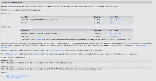 KeePass encrypts everything in your vault with AES-256 in CBC mode, the same cipher trusted by governments and banks. You can also switch to ChaCha20 or Twofish if you want to get fancy. For key derivation, it supports AES-KDF or Argon2id, both designed to slow down brute-force cracking. In practice, this means even if an attacker got your database file, they’d face years before making a dent, provided you chose a strong master password.