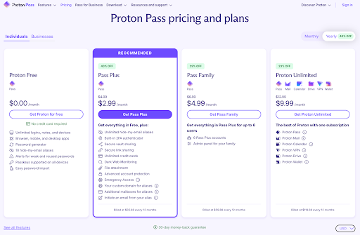 Proton offers personal and business tiers for Proton Pass, all integrated into its overall ecosystem. The free plan is quite good, and the paid options are pretty affordable as well if you’re willing to commit to an annual plan.