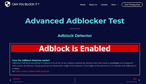 What it Tests: The site checks the Document Object Model (DOM) to see if an ad-like element (e.g., a div with the class ad-widget) has been forced to a zero height or removed. It also tests for the direct blocking of the script responsible for displaying the “content blocker” overlay itself.